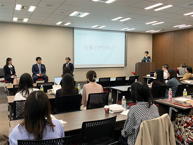 パネルディスカッションでは、「仕事のやりがい」「ヘラルボニーのような先進的な取り組みをする企業にとって西村あさひの存在意義・価値」「弁護士・スタッフへ一言」の3つのテーマを軸に、玄 唯真様、当事務所からは同社の顧問弁護士を務める山本 晃久とアシスタントの德永 千晴が登壇しました。