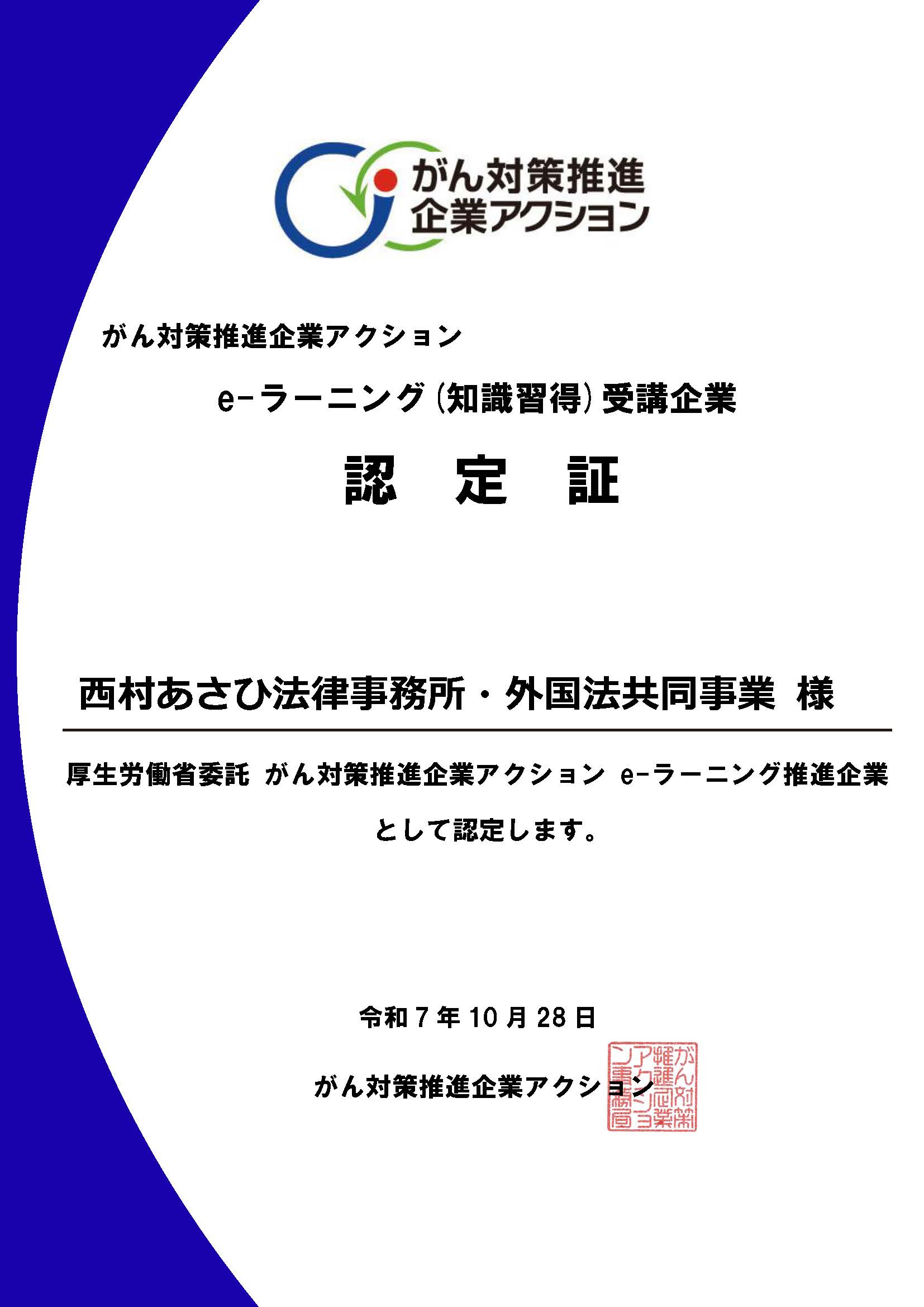 さらに、がんに関する正しい知識を学び、日々の行動につなげることを目的として、e-learningプログラムを実施し、がん対策推進企業アクションより「e-ラーニング受講企業」として認定されました。